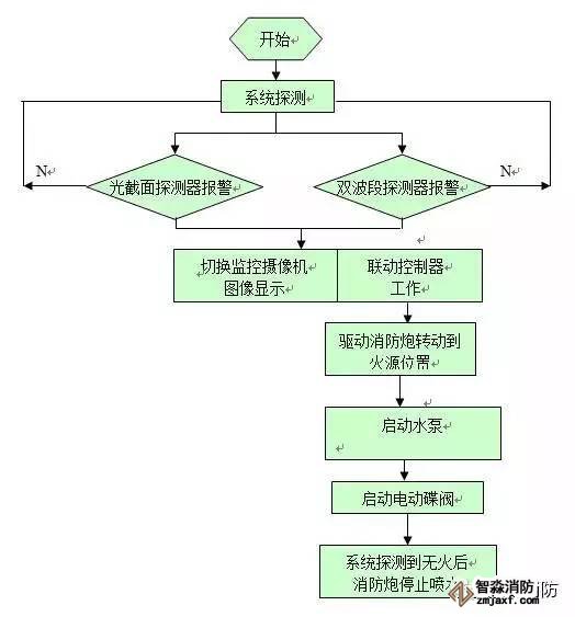 2)控制室手動滅火方式:消防控制中心接收到火災報警系統的火警信號后,消防控制中心值班人員在消防控制室通過系統強行切換過來的彩色視頻圖像進一步確認,值班人員通過操作消防炮集中控制盤,調整消防炮對準著火點,啟動消防水泵和開啟電動閥門,實施噴水滅火。