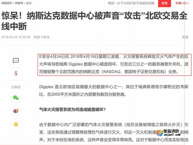 結論:本條是針對目前很多數據中心安裝氣體滅火系統,經過實驗噴嘴噴放時的噪音達到100分貝以上時,會造成服務器磁盤震裂而造成重大損失,在2018年4月份曾因氣體滅火噴放的巨大噪音導致瑞典數據中心大量磁盤損壞,有三分之一的服務器關機,進而造成北歐納斯達克業務停擺。